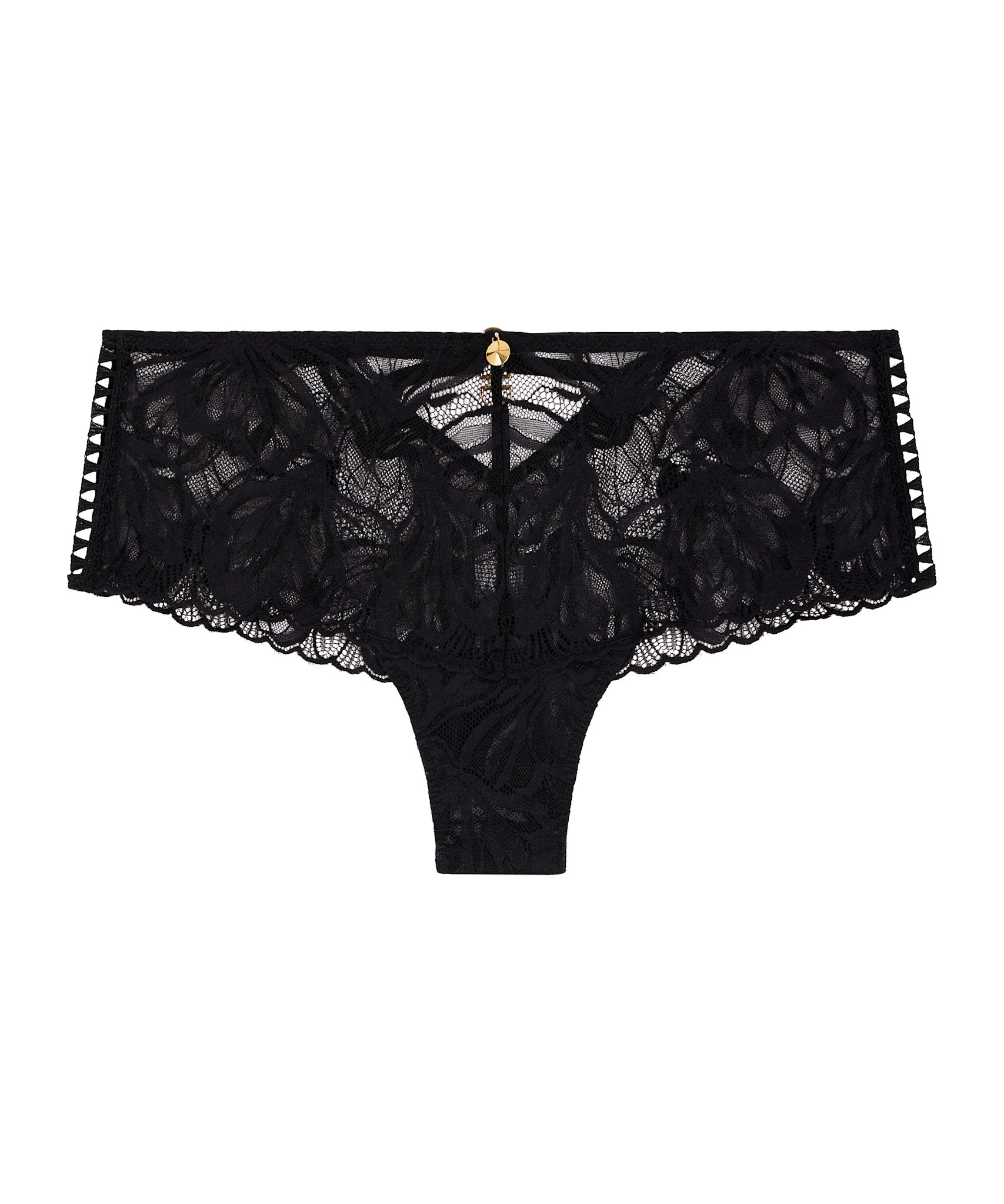 De After Hours Shorty is gemaakt van bloemenkant en opengewerkt geometrisch guipre kant. Over de onderrug lopen bondage-achtige bandjes over een sensuele opening. De voorzijde heeft een goudkleurig bedeltje.