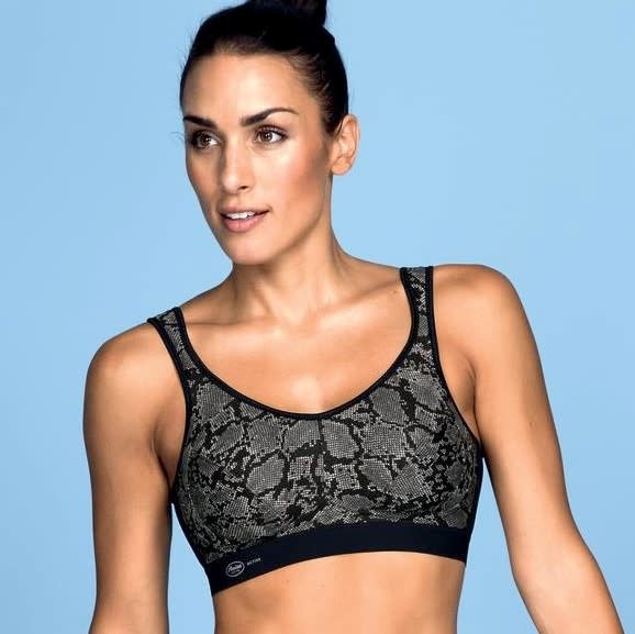 De Extreme control sport BH van Anita Active in de kleur python heeft driedelige genaaide cups met zijwaarts ingezette steunstrook. Deze geven de borst tot in grote cups een mooie vrouwelijke vorm en betrouwbare steun. De binnenzijde van de cups zijn naadloos. Het materiaal is speciaal ontworpen voor sport BH's en bestaat uit Piqué-materiaal met Frottée dat de huid droog houdt.