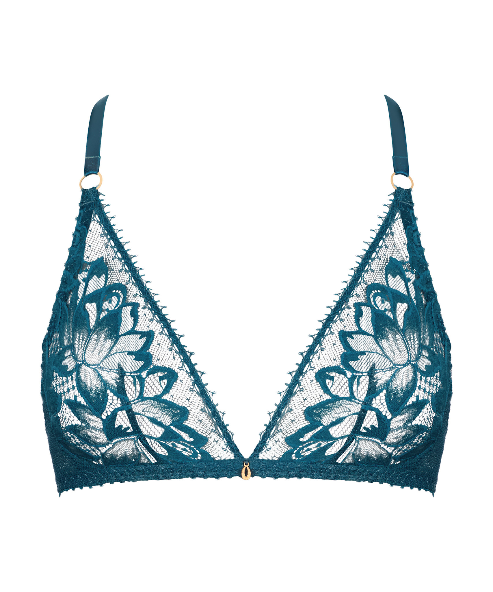 Flawless Love van Aubade is weer een meesterwerk. Flawless Love in de kleur Dragonfly is comfortabel en sexy. De Bralette heeft aan de voorzijde een diepe plunge. Over de achterkant lopen over de blote rug kruislings dunne bandjes. Het verfijnde wimperkant valt prachtig over de borsten heen. De collectie is gemaakt van semi-transparant en elegant Leavers kant met een delicaat lotusmotief, gemaakt in Frankrijk. De accessoires zijn goudkleurig.