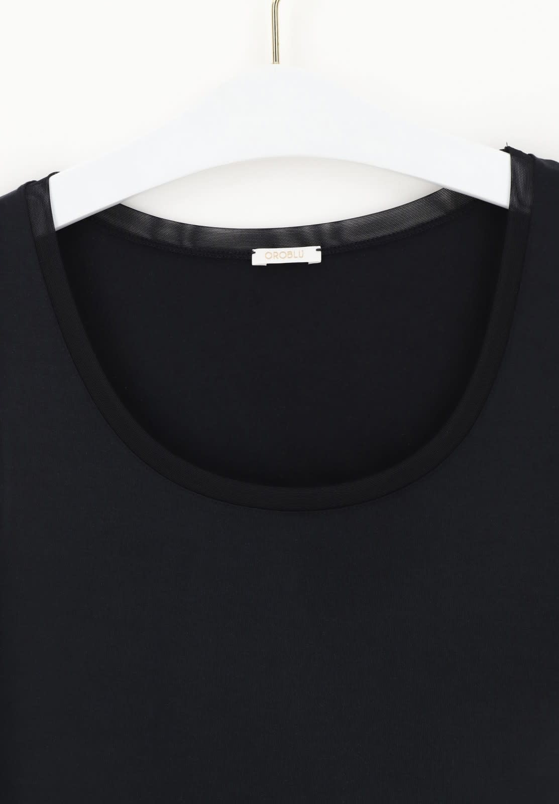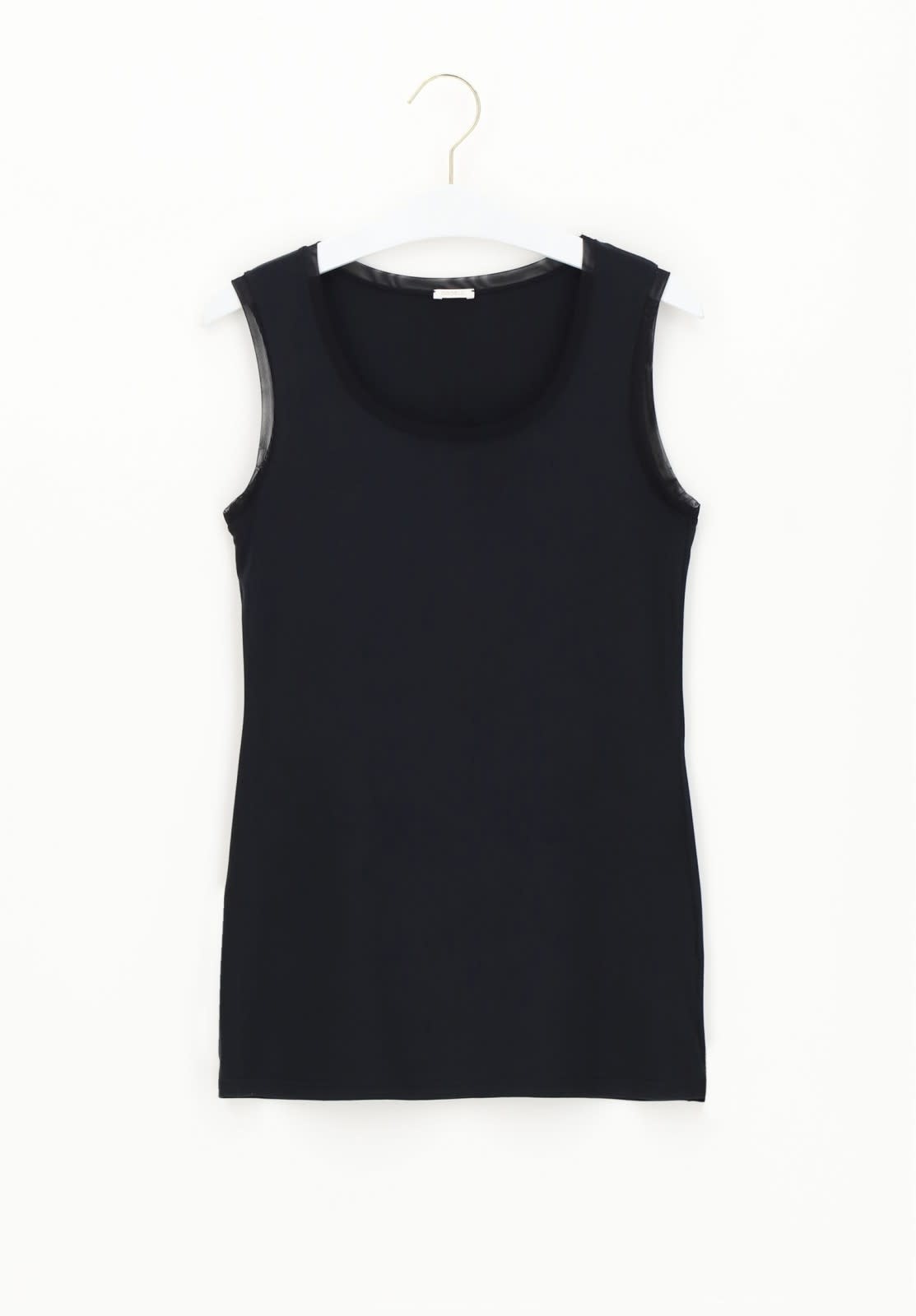 Top met een lage ronde hals en brede bandjes. Deze zijn afgezet met een dunne rand met transparante optiek. Zeer zacht en soepel vallend, met de luxe uitstraling van zijde.