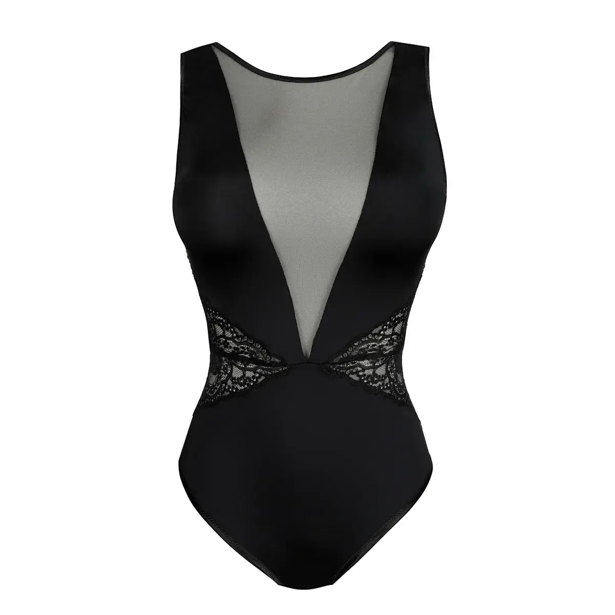 Shimla van PrimaDonna is gemaakt van Italiaanse broderie met stretchkant en glinsterende, fijne details. De Shimla Body heeft zowel aan de achterkant als de voorkant een diep uitgesneden effect door de mesh stof. Heel elegant en sexy. De body heeft geen beugels. Style met een mooi pak.
