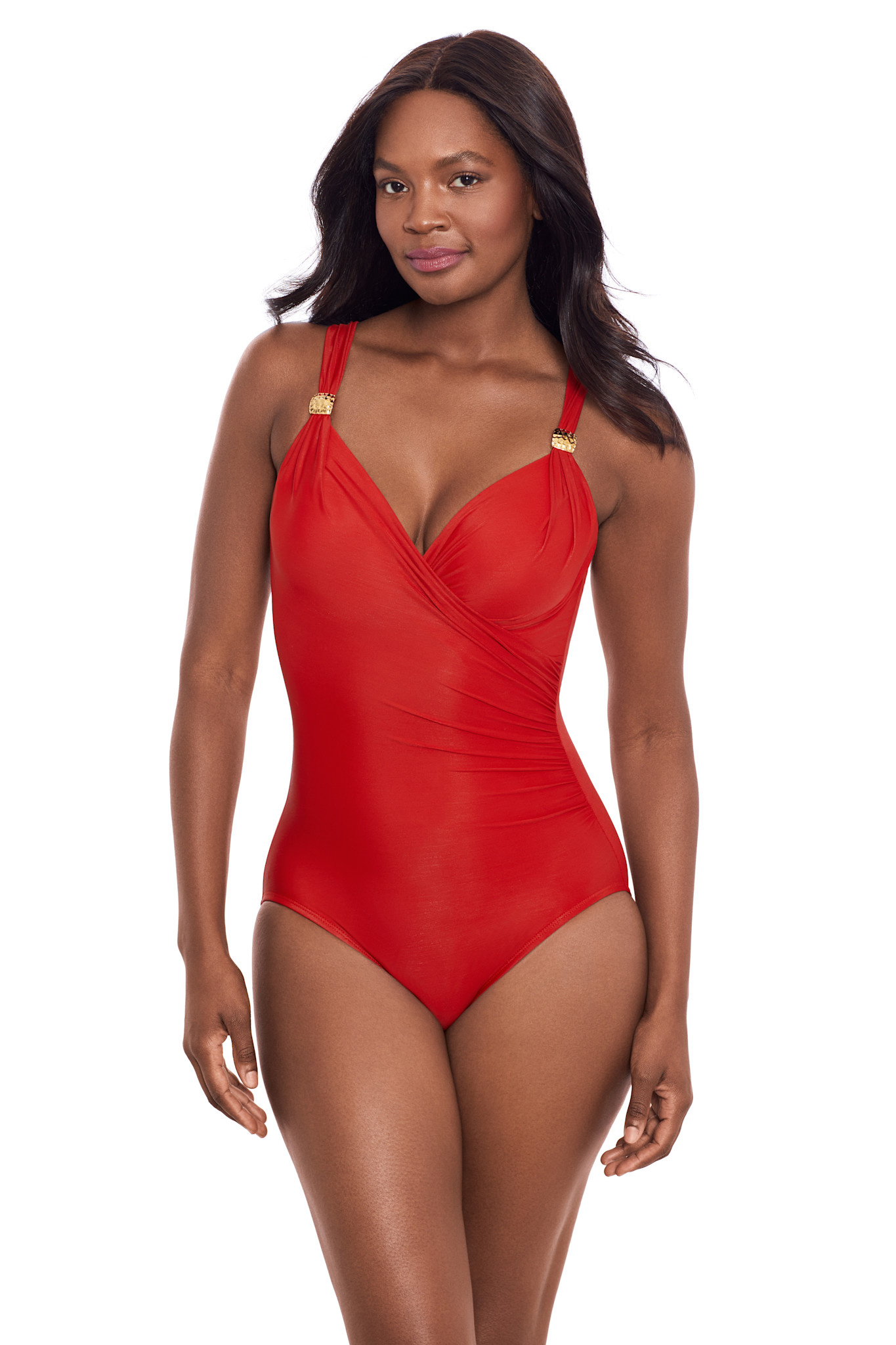 Het Siren Razzle Dazzle badpak van Miraclesuit in de kleur Cayenne Red: Een prachtige padpak met voorgevormde cups. Dit badpak heeft wederom een amazing shapend effect.