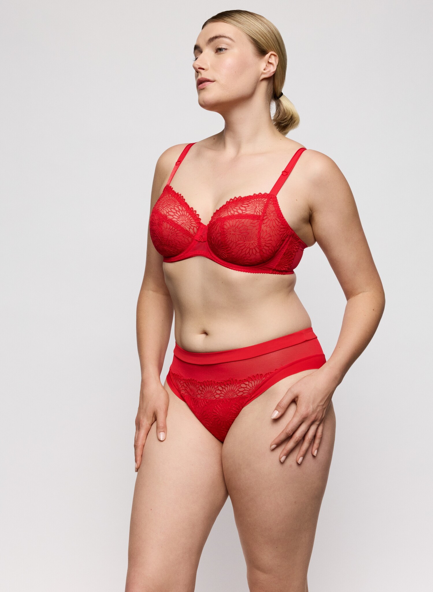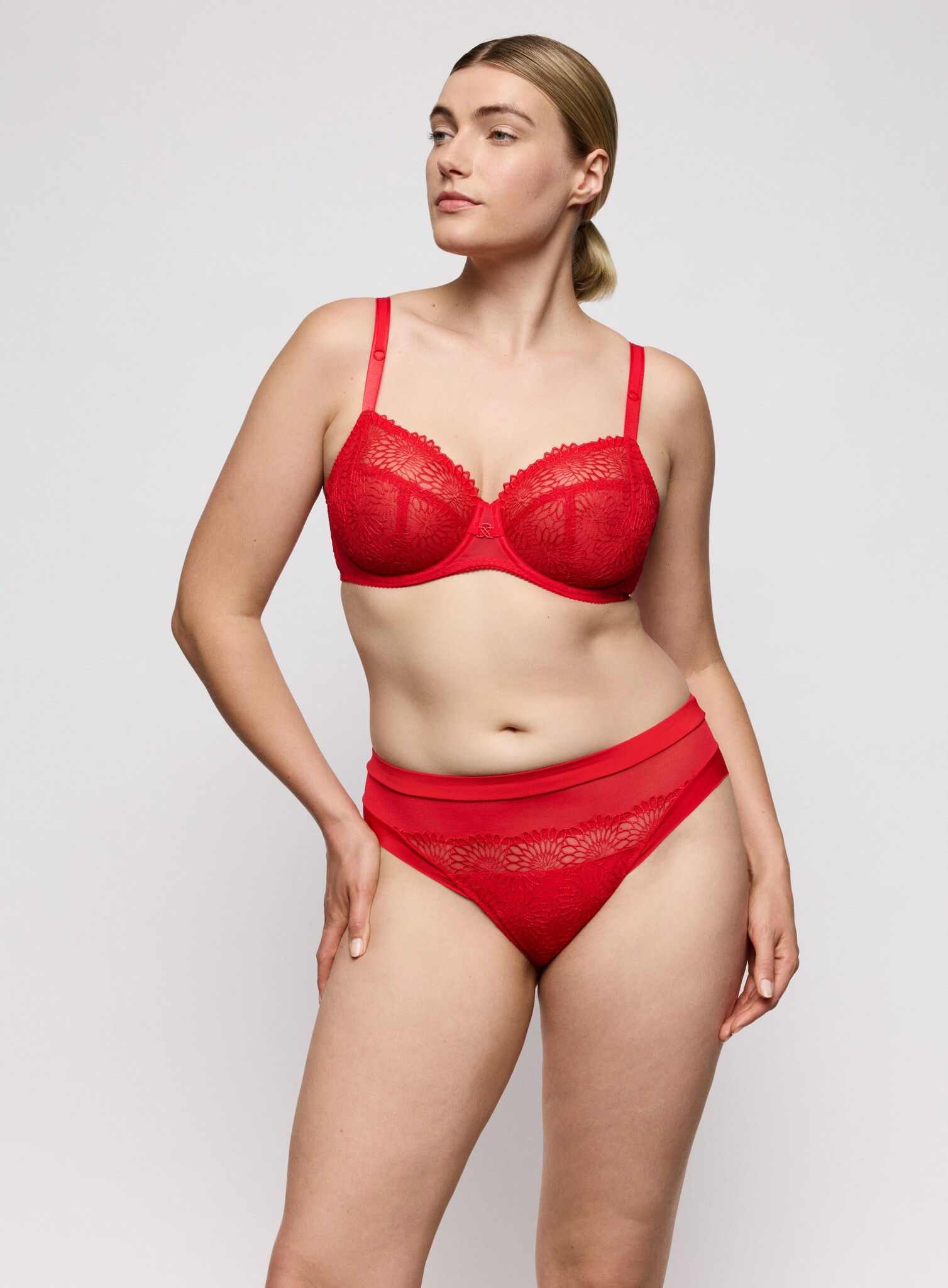 De Sophora Riopslip van PrimaDonna heeft een sexy retrolook versierd met rood gekleurde broderie op tule. De tule heeft een prachtige glans die door de broderie heen schijnt en een tattoo effect creëert. De slip valt net als een klassieke slip iets lager
