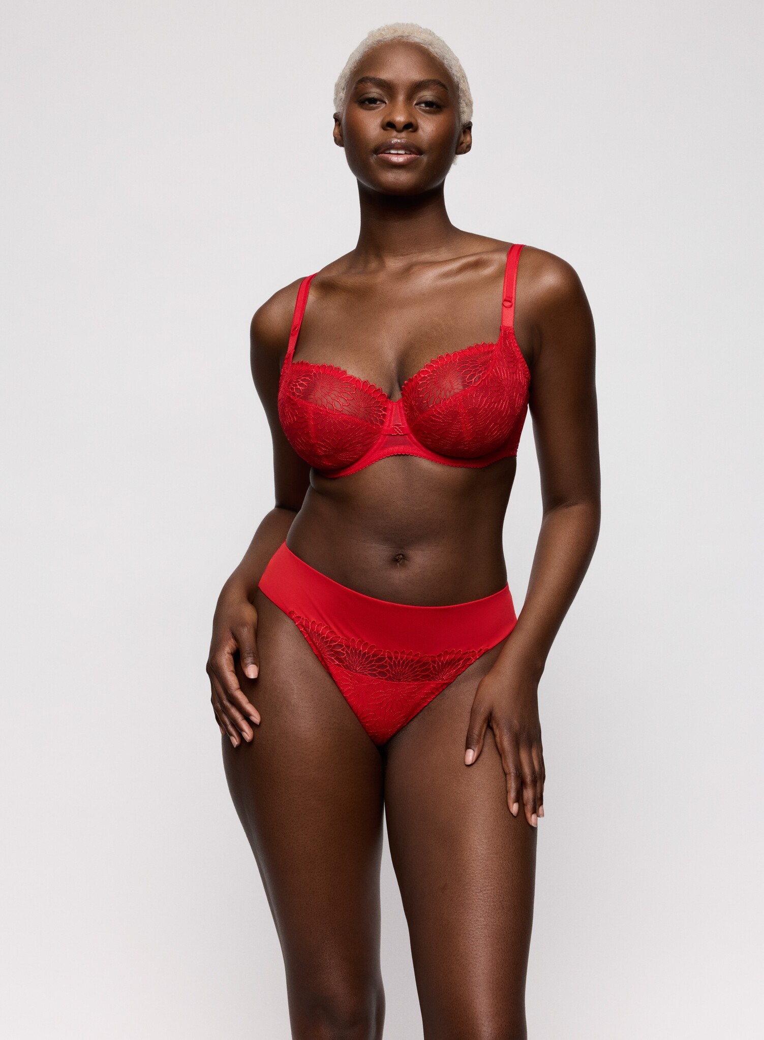 De Sophora String van PrimaDonna heeft een sexy retrolook versierd met roodgekleurde broderie op tule. De tule is rood kleurig met een prachtige glans die door de broderie heen schijnt en een tattoo effect creëert. De string zit laag in de taille en loopt aan de achterzijde hoog over de billen naar boven. Mooi bij de Sophora BH van PrimaDonna.