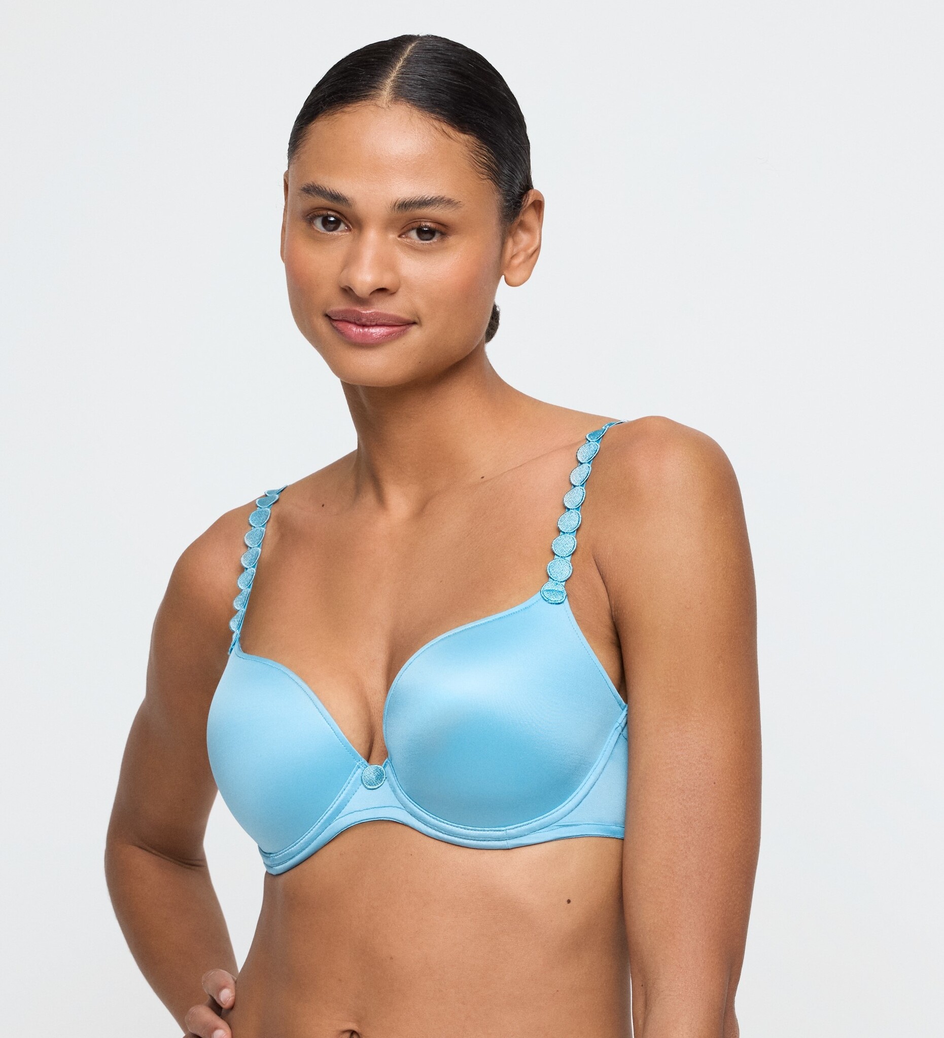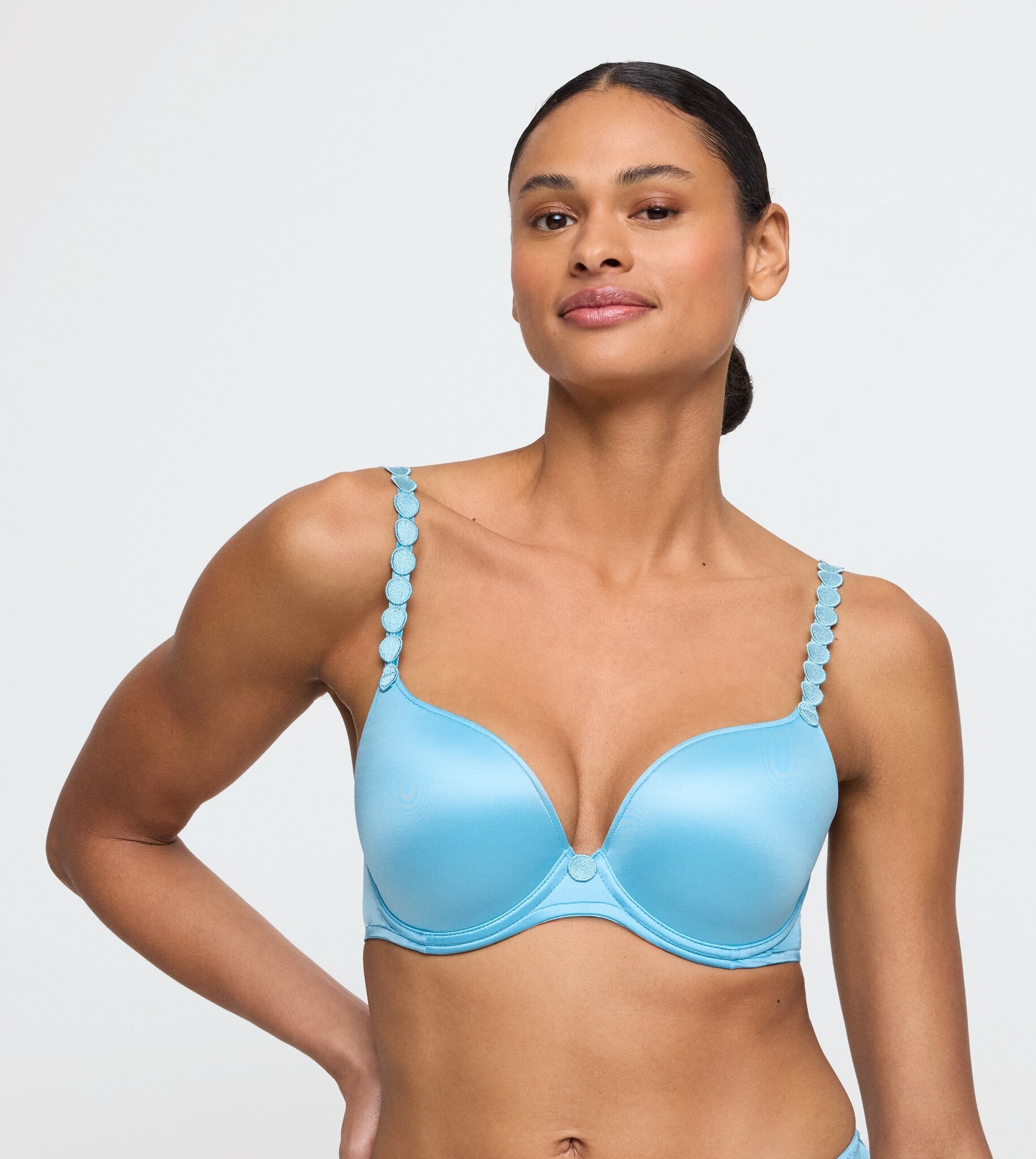 De Tom Heart Shape BH van Marie Jo is een mousse BH met hartvormige cup. De cup omvat bovenaan een groot deel van de borst. De hoge decolleté belijning boven de borst loopt diep omlaag tussen de borsten, dus dat geeft een mooie plunge. De schouderbandjes zijn mooi afgewerkt met de iconische cirkeltjes. De kleur van de BH is Azure Delight, een warme lichtblauwe kleur. De schouderbandjes zijn recht over de schouders, kruislings en als halter te dragen. Style met de slips van Tom in dezelfde kleur.