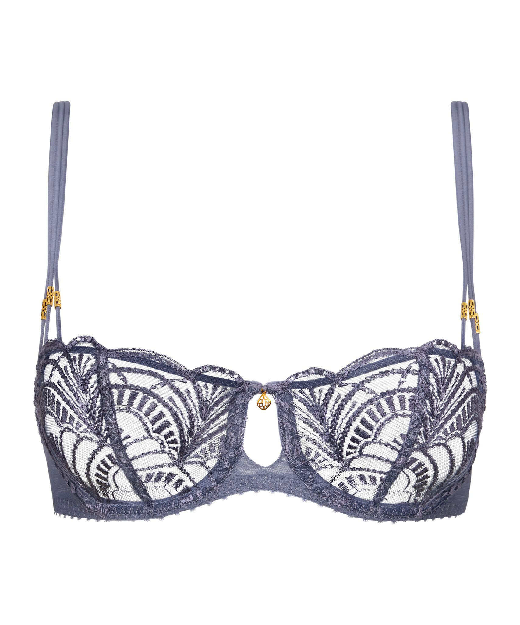 De Vibes Balconette BH is weer een meesterwerk. De decolleté komt rond en schitterend tot haar recht. Het kant heeft grafische patronen. De schouderbandjes bestaan uit 3 bandjes met goudkleurige buisjes en tussen de cups bevindt zich ene goudkleurige acce